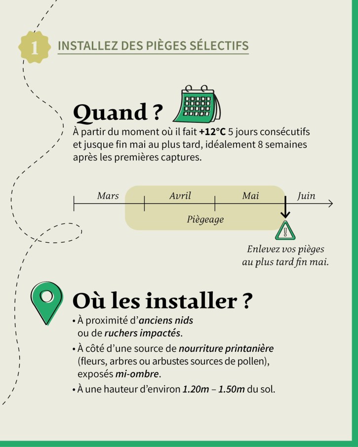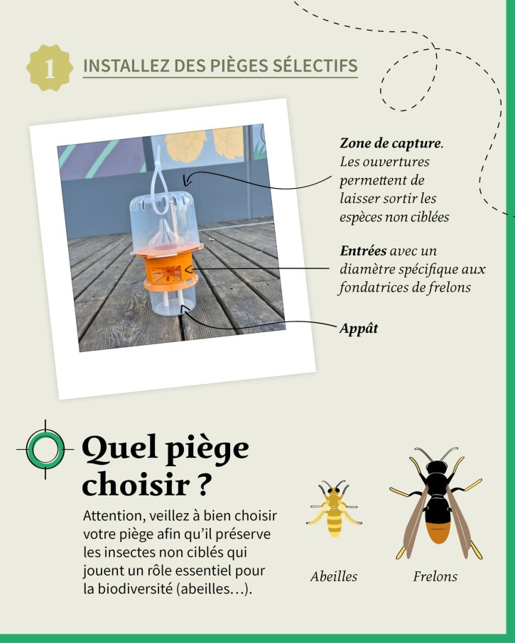 Installez des pièges sélectifs. L'objectif : capturer les fondatrices avant qu'elles ne créent des nids. Attention, choisissez bien des pièges sélectifs afin de préserver les insectes non ciblés qui jouent un rôle primordial pour la biodiversité.
